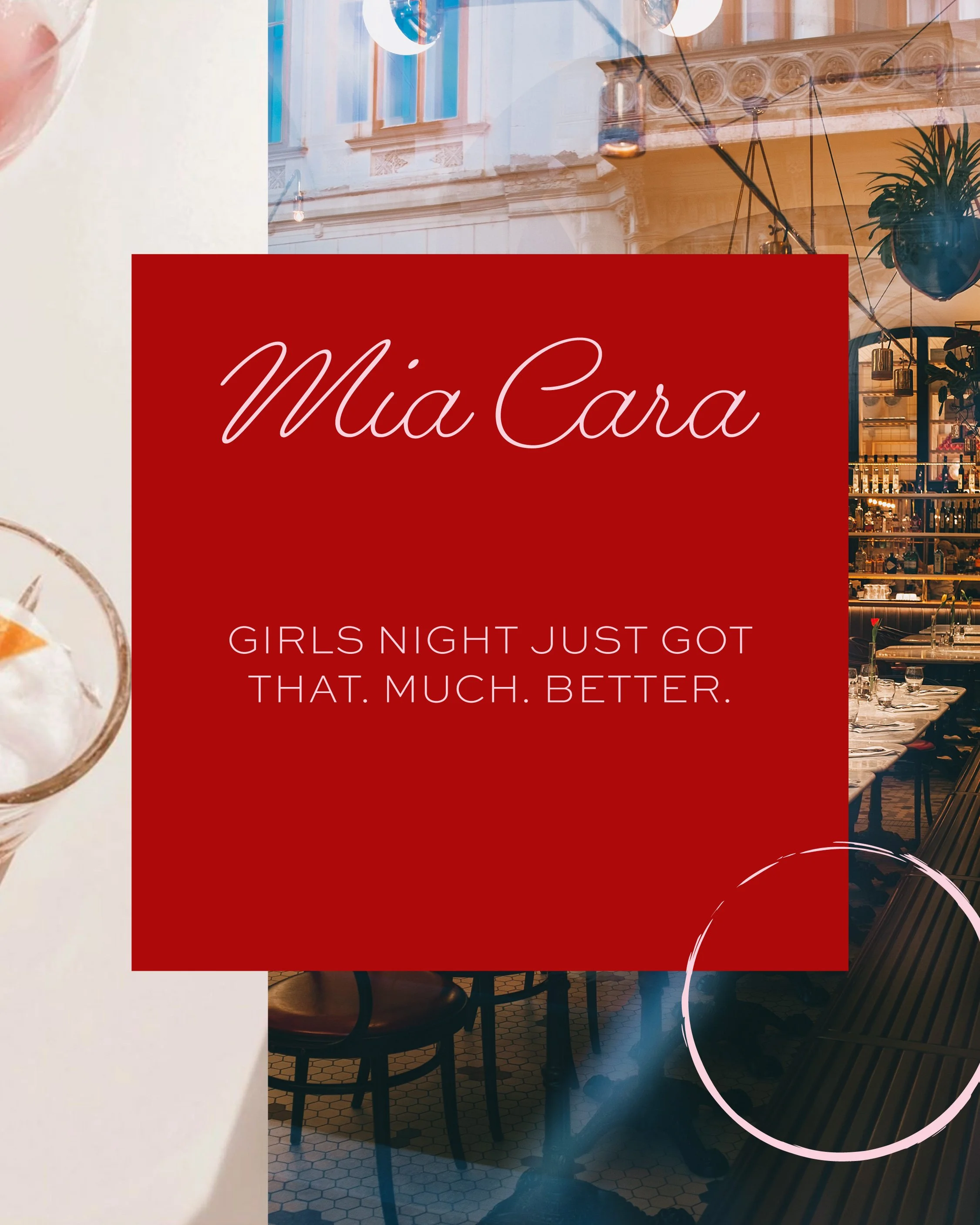 Mia Cara, Italian for “my dear,” is a new dining experience that is perfect for your girls dinner party or simply celebrating life with a memorable meal with sweet company. Walking through the doors of Mia Cara you are welcomed into a joyful, bubbly atmosphere that transports you to the Trattorias of Italy. Mia Cara is happy to see you. Take a seat, my dear. Enjoy Mia Cara!